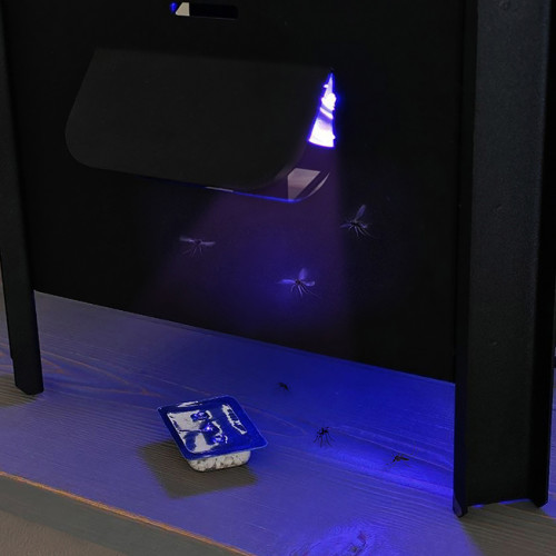 The tests proved that effectiveness of mosquito attraction was increased by 3-4 times and the protected area expanded by 2-3 times. Such a powerful effect is explained by the fact that mosquitoes sense the attractant from a much farther distance than UV rays and they remain interested in it when they approach the killing machine. Therefore, with the use of attractant, mosquito killing machines attract significantly more pests and they all end up in the trap.