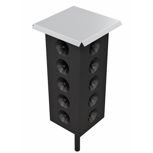 "GRAD A-20 Pro" is a bioacoustic bird repeller equipped with a powerful remote omnidirectional acoustic unit with 20 speakers, therefore it covers a huge area — up to 10 ha! It is designed to protect large territories and objects: fields, vineyards, airports, orchards, and can also be used in urban environments. It is effective against various types of feathered pests, including sparrows, pigeons, crows, seagulls, starlings, thrushes and others. It is characterized by increased resistance to adverse environmental conditions (IP54 standard) and full autonomy, as it is equipped with a powerful 50W solar panel. The device also works from any available power source (220V or 12V).